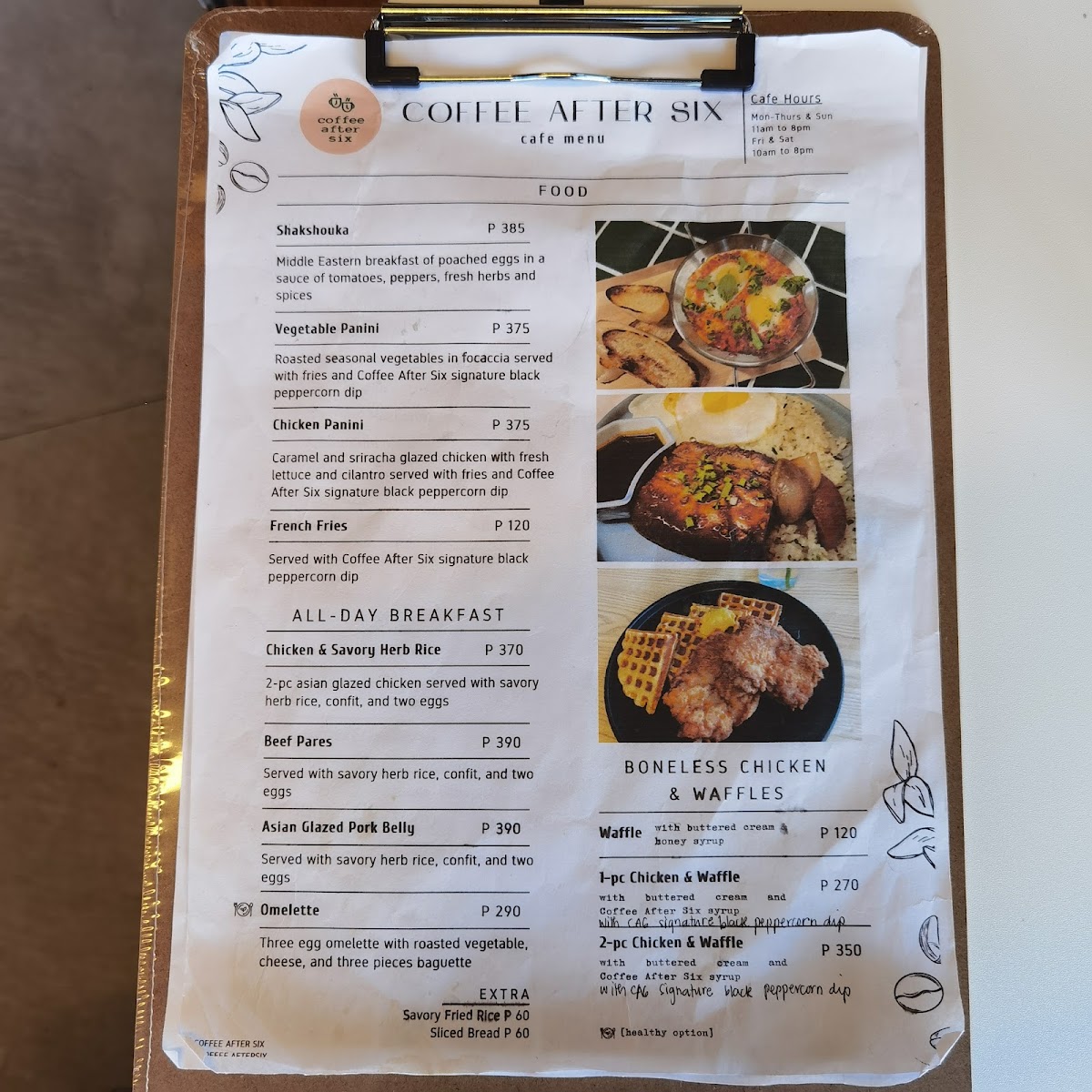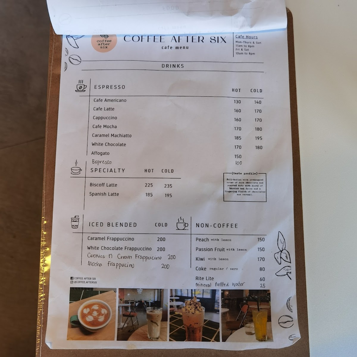 Welcome to Coffee After Six, a charming cafe located at 345 Aguirre Ave, Parañaque. This spot is a haven for coffee aficionados and casual diners alike, offering a cozy ambiance perfect for unwinding or catching up with friends.
